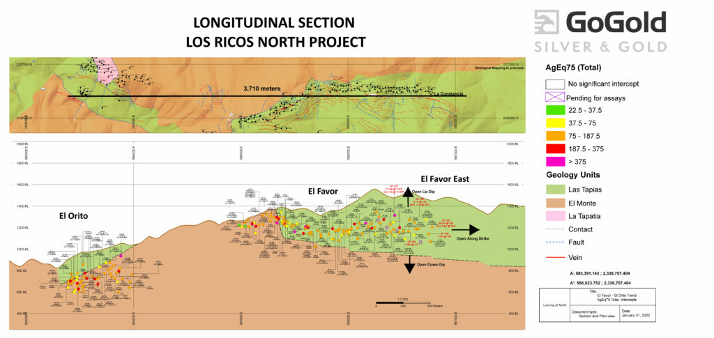 El Favor is located approximately 800 meters along strike to the east of the El Orito deposit. The longitudinal section in Figure 5 below shows that the combined systems cover approximately 2.9km in mineralized strike length over a 3.7km distance. At El Orito, wide zones of precious and base metal mineralization were cut by drill holes at El Orito at elevations between 600 to 900m. The drill holes at El Favor have cut primarily silver-gold mineralization with trace to minor amounts of base metals at a higher elevation in the system, between 1,050m to 1,400m, compared to the semi-massive to massive base metal sulphide mineralization seen deeper in the El Orito deposit.