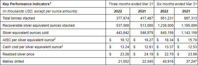 Additional GAAP measures that are presented on the face of the Company’s consolidated statements of comprehensive income include “Operating income (loss)”. These measures are intended to provide an indication of the Company’s mine and operating performance. “Cash flow from operating activities before changes in non-cash working capital” is a non-GAAP performance measure that could provide an indication of the Company’s ability to generate cash flows from operations, and is calculated by adding back the change in non-cash working capital to “Net cash used in operating activities” as presented on the Company’s consolidated statements of cash flows. Per ounce measures are calculated by dividing the relevant mining and processing costs and total costs by the tonnes of ore processed in the period. “Cash costs per ounce” and “all-in sustaining costs per ounce” as used in this analysis are non-GAAP terms typically used by mining companies to assess the level of gross margin available to the Company by subtracting these costs from the unit price realized during the period. These non-GAAP terms are also used to assess the ability of a mining company to generate cash flow from operations. There may be some variation in the method of computation of these metrics as determined by the Company compared with other mining companies. In this context, “cash costs per ounce” reflects the cash operating costs allocated from in-process and dore inventory associated with ounces of silver and gold sold in the period. “Cash costs per ounce” may vary from one period to another due to operating efficiencies, grade of material processed and silver/gold recovery rates in the period. “All-in sustaining costs per ounce” include total cash costs, exploration, corporate and administrative, share based compensation and sustaining capital costs. For a reconciliation of non-GAAP and GAAP measures, please refer to the Management Discussion and Analysis dated February 8, 2022 for the quarter ended December 31, 2021, as presented on SEDAR.