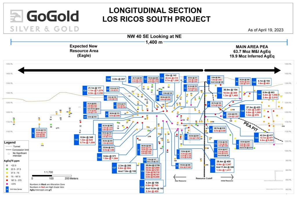 HALIFAX, NS, April 19, 2023 /CNW/ – GoGold Resources Inc. (TSX: GGD) (OTCQX: GLGDF) (“GoGold”, “the Company”) is pleased to announce additional drilling results from Los Ricos South, within the Eagle Deposit. Hole LRGAG-22-145 intercepted 42.2m of 417 g/t silver equivalent (“AgEq”), including 14.2m of 977 g/t AgEq which also contained 6,951 g/t AgEq over 0.5m. See Table 1 for breakdown of silver and gold values.