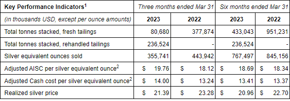 Additional GAAP measures that are presented on the face of the Company’s consolidated statements of comprehensive income include “Operating income (loss)”. These measures are intended to provide an indication of the Company’s mine and operating performance. Per ounce measures are calculated by dividing the relevant mining and processing costs and total costs by the tonnes of ore processed in the period. “Adjusted cash costs per ounce” and “Adjusted all-in sustaining costs per ounce” are used in this analysis and are non-GAAP terms typically used by mining companies to assess the level of gross margin available to the Company by subtracting these costs from the unit price realized during the period. These non-GAAP terms are also used to assess the ability of a mining company to generate cash flow from operations. There may be some variation in the method of computation of these metrics as determined by the Company compared with other mining companies. In this context, “Adjusted cash costs per ounce” reflects the cash operating costs allocated from in-process and dore inventory associated with ounces of silver and gold sold in the period. “Adjusted cash costs per ounce” may vary from one period to another due to operating efficiencies, grade of material processed and silver/gold recovery rates in the period. “Adjusted all-in sustaining costs per ounce” include total cash costs, exploration, corporate and administrative, share based compensation and sustaining capital costs. For a reconciliation of non-GAAP and GAAP measures, please refer to the Management Discussion and Analysis dated May 9, 2023 for the three months ended March 31, 2023, as presented on SEDAR.