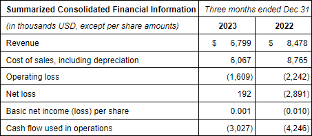 Highlights for the quarter ending December 31, 2023: