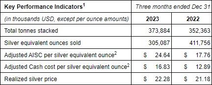 Additional GAAP measures that are presented on the face of the Company’s consolidated statements of comprehensive income include “Operating income (loss)”. These measures are intended to provide an indication of the Company’s mine and operating performance. Per ounce measures are calculated by dividing the relevant mining and processing costs and total costs by the tonnes of ore processed in the period. “Adjusted cash costs per ounce” and “Adjusted all-in sustaining costs per ounce” are used in this analysis and are non-GAAP terms typically used by mining companies to assess the level of gross margin available to the Company by subtracting these costs from the unit price realized during the period. These non-GAAP terms are also used to assess the ability of a mining company to generate cash flow from operations. There may be some variation in the method of computation of these metrics as determined by the Company compared with other mining companies. In this context, “Adjusted cash costs per ounce” reflects the cash operating costs allocated from in-process and dore inventory associated with ounces of silver and gold sold in the period. “Adjusted cash costs per ounce” may vary from one period to another due to operating efficiencies, grade of material processed and silver/gold recovery rates in the period. “Adjusted all-in sustaining costs per ounce” include total cash costs, exploration, corporate and administrative, share based compensation and sustaining capital costs. For a reconciliation of non-GAAP and GAAP measures, please refer to the Management Discussion and Analysis dated February 6, 2024 for the three months ended December 31, 2023, as presented on SEDAR.