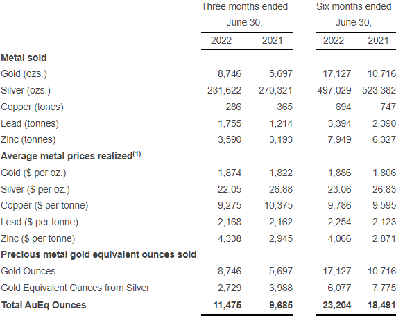 DENVER–(BUSINESS WIRE)–Gold Resource Corporation (NYSE American: GORO) (the “Company”) sold a total of 8,746 ounces of gold and 231,622 ounces of silver in Q2 2022 for a gold equivalent total of 11,475 ounces. Additionally, the Company sold 3,590 tonnes of zinc, 286 tonnes of copper, and 1,755 tonnes of lead contributing to a strong cash balance of over $33 million.