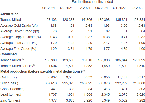 (1) Combined tonnes milled in Q1, Q2 and Q3 2021 included 11,577, 3,227 and 204 tonnes from the Open Pit Mine, respectively. The Open Pit Mine is no longer in production as of Q3 2021. Additionally, Q1 and Q2 2022 combined tonnes milled includes 1,043 and 215 purchased tonnes, respectively, related to an environmental initiative with a local community.