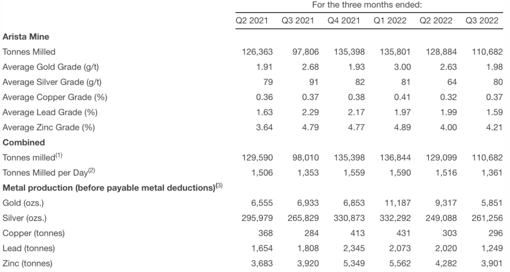 (1) Combined tonnes milled in Q2 and Q3 2021 included 3,227 and 204 tonnes from the Open Pit Mine, respectively. The Open Pit Mine is no longer in production as of Q3 2021. Additionally, Q1 and Q2 2022 combined tonnes milled includes 1,043 and 215 purchased tonnes, respectively, related to an environmental initiative with a local community.