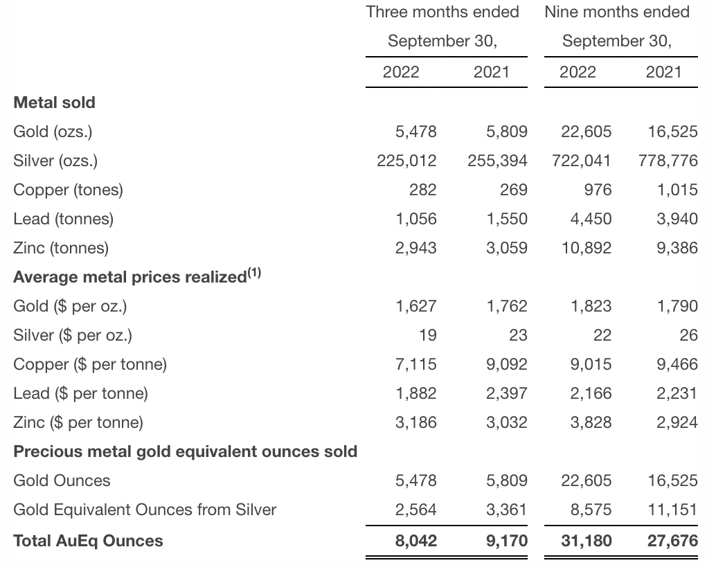 DENVER–(BUSINESS WIRE)–Gold Resource Corporation (NYSE American: GORO) (the “Company”) sold a total of 5,478 ounces of gold and 225,012 ounces of silver in Q3 2022 for a gold equivalent total of 8,042 ounces. Additionally, the Company sold 2,943 tonnes of zinc, 282 tonnes of copper, and 1,056 tonnes of lead contributing to a strong cash balance of over $22 million.