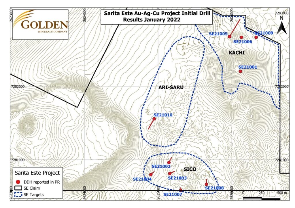 GOLDEN, CO – /BUSINESS WIRE/ – January 19, 2022– Golden Minerals Company (“Golden Minerals”, “Golden” or the “Company”) (NYSE-A: AUMN and TSX: AUMN) is pleased to announce assay results from the first drill program ever conducted at its Sarita Este gold-silver-copper prospect in Salta Province, Argentina. The Company drilled 10 diamond drill (“DD”) holes totaling 2,518 meters (“m”) exploring several targets of untested epithermal gold-silver and copper porphyry targets. Highlights from the drilling include: