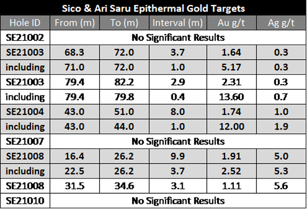 Six holes totaling 1,020 meters were drilled exploring a series of gold-bearing epithermal structures identified by surface mapping and sampling conducted in 2020 that returned grades up to 162 g/t Au at surface. The drill holes intersected multiple wide zones of near-surface oxide-gold mineralization, indicating the area has the potential to host a large bulk tonnage gold deposit. New permits have been submitted for trenching and additional drilling that the Company plans to complete during a 2022 field campaign.