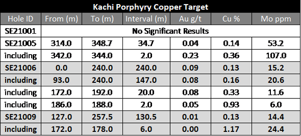 The Kachi target is located in the northern corner of the property where surface mapping and sampling has identified porphyry copper-style mineralization. The Company completed four holes totaling 1,498 meters exploring this target and the majority of the holes encountered wide zones of low-grade copper mineralization, suggesting that they intersected the periphery of a potentially large porphyry copper deposit.
