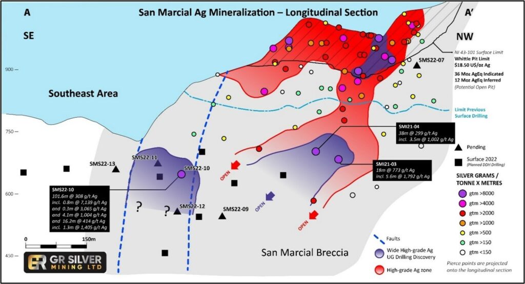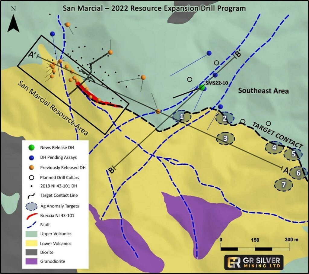 VANCOUVER, BC, Aug. 8, 2022 /CNW/ – GR Silver Mining Ltd. (“GR Silver Mining” or the “Company”) (TSXV: GRSL) (OTCQB: GRSLF) (FRANKFURT: GPE) – is pleased to announce a new silver (Ag) discovery in the first drill hole stepping out 250 m to the southeast of the San Marcial Resource Area on the wholly-owned Plomosas Project in Sinaloa, Mexico. Surface drill hole SMS22-10 intersected 101.6 m at 308 g/t Ag (from 98.5 m down hole), including multiple intervals grading over 1,000 g/t Ag. The hole was drilled 250 m to the SE of the San Marcial Resource Area, where the Company has been exploring the extension of the target contact between upper and lower volcanic units, which typically hosts the San Marcial Breccia Ag mineralization, together with strong ground magnetic anomalies delineated in 2021. The drilling to date in the new area has identified a more extensive breccia and stockwork mineralization, rich in Ag, immediately below the contact zone and extending mineralization far below the original target zone. This new, wide, high-grade silver discovery coincides with an inflexion in the NW-SE trending contact where it intersects with two key NE-SW trending faults (Figure 1). This defines a highly prospective target for continued drilling, both along strike and down dip.