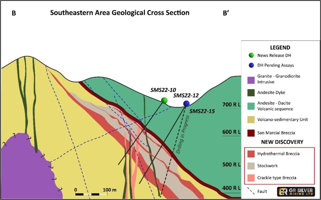 GR Silver Mining has identified several additional targets in the Southeast Area. Drill holes SMS22-11 to SMS22-13 have been recently completed and are currently being logged and sampled. Laboratory analysis for these holes is pending. Specifically, drill hole SMS22-12 was drilled below the SMS22-10 discovery hole, whilst an additional hole (SMS22-15) is currently in the early stages of drilling below SMS22-12 (Figure 3). The Company anticipates that drilling will continue with two rigs over the coming months in the Southeast Area of San Marcial.