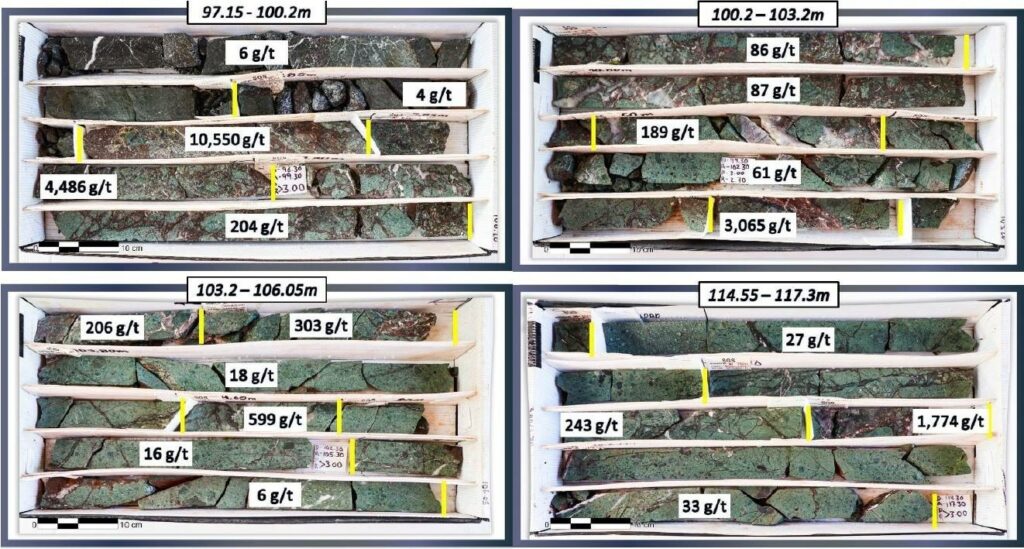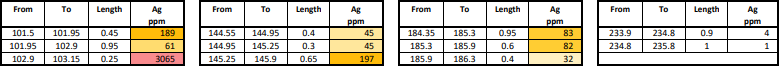 0.3 m at 3,065 g/t Ag (from 102.9 m)