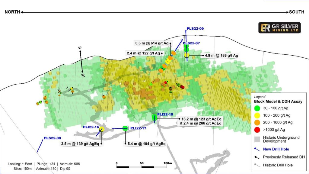 Eight of the holes reported in this news release, PLI22-08, PLI22-09, PLI22-12, PLI22-19, PLIP22-023, PLIP22-024, PLIP22-025 and PLIP22-028 were drilled in locations where zero values were adopted in GR Silver Mining’s 2021 resource estimation, due to un-sampled historical intervals. Overall, the results indicate the presence of silver mineralization including some isolated high-grade zones such as PLI22-12: 5.7 m at 514 g/t Ag.