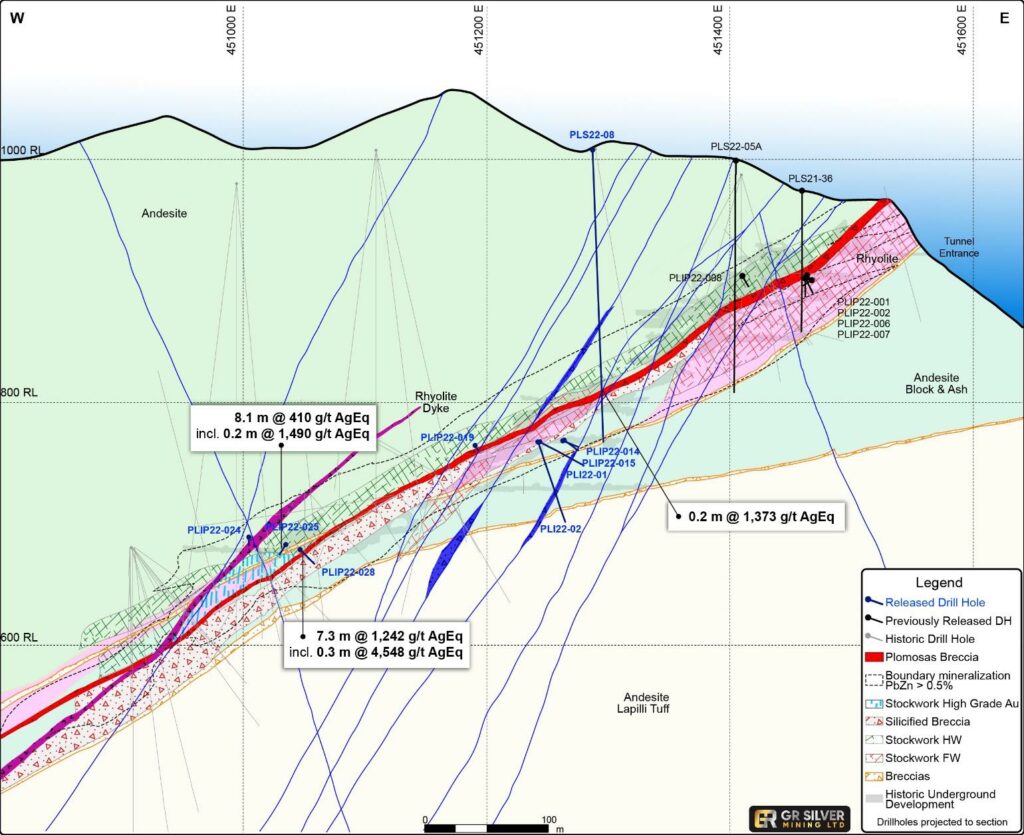 Vancouver, BC – GR Silver Mining Ltd. (“GR Silver Mining” or the “Company”) (TSXV|GRSL, OTCQB|GRSLF, FRANKFURT|GPE) – is pleased to announce infill drilling results that make up part of the resource update program in progress at the Plomosas Mine Area, Plomosas Project in Sinaloa, Mexico. These drill holes were targeted by the Company to replace historical holes used in the 2021 NI 43-101 mineral resource estimate, where zero values were assigned, or to test new near-surface and underground high-grade Ag-Au mineralized zones, identified in the recent underground sampling/mapping program. The infill drilling program is continuing in the Plomosas Mine Area through the latter part of 2022, in anticipation of an updated resource estimate in Q1|2023.