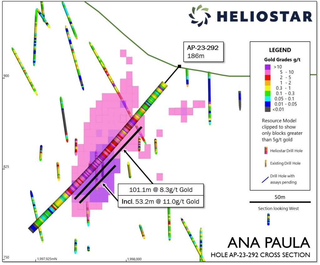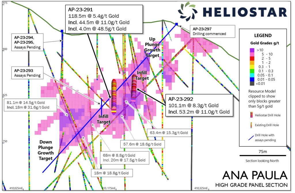Heliostar CEO, Charles Funk, commented, “We are thrilled with the first holes at Ana Paula. Drill results like this are rare anywhere in the world. Ana Paula’s high grade and consistently wide intervals of gold mineralization demonstrate the underground mine potential. Heliostar will continue the 16-24 hole program designed to increase the Ana Paula resource, with a focus on infill and expansion of the High Grade Panel. Both holes exceeded expectations based on the current resource model. Hole AP-23-291 is particularly encouraging as it returned a 30% increase relative to the current resource model, at a >5 g/t cut-off grade. This builds confidence that infill drilling can increase ounces and potentially lift the overall grade of the deposit.”