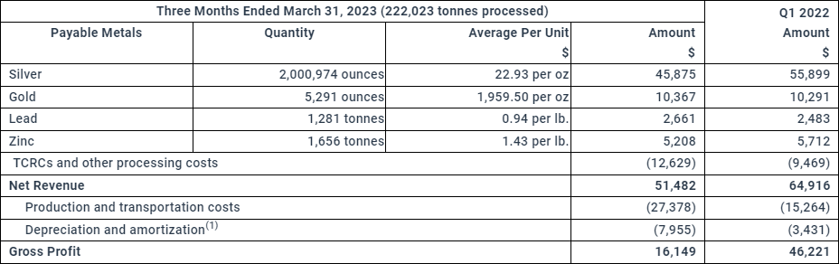 - pre-commercial production revenue (net of treatment and processing costs) totalled $51,482 for the quarter, less $27,378 in production and transportation costs and $7,955 in depreciation and amortization charges, netting $16,149 in gross profit by Juanicipio.