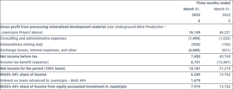 The Company’s net income for the three months ended March 31, 2023 amounted to $4,713 (March 31, 2022: $2,680) or $0.05/share (March 31, 2022: $0.03/share). MAG recorded its 44% income from equity accounted investment in Juanicipio of $7,919 (March 31, 2022: $13,762) which included MAG’s 44% share of net income from the sale of pre-production development and stope material as well as loan interest earned on loans advanced to Juanicipio (see Table 2 below).