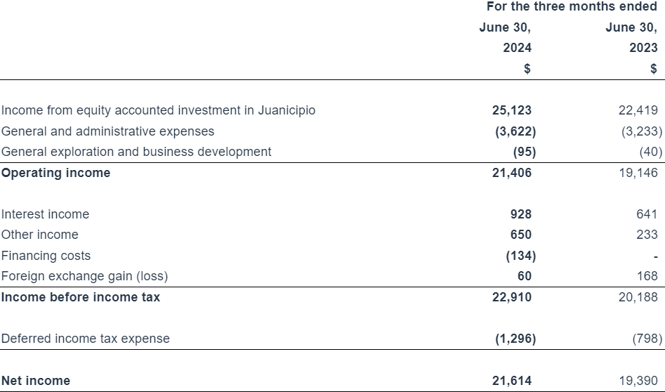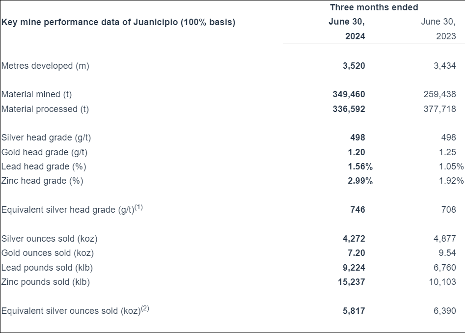 The following table presents excerpts of the financial results of Juanicipio for the three months ended June 30, 2024 and 2023.