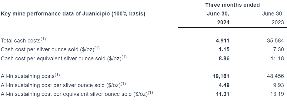 The following table provides a summary of the total cash costs and all-in sustaining costs (“AISC”) of Juanicipio for the three months ended June 30, 2024, and 2023.