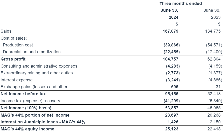 The Company’s net income for the three months ended June 30, 2024 amounted to $21,614 (June 30, 2023: $19,390) or $0.21/share (June 30, 2023: $0.19/share). MAG recorded its 44% income from equity accounted investment in Juanicipio of $25,123 (March 31, 2023: $22,419) which included MAG’s 44% share of net income from operations as well as loan interest earned on loans advanced to Juanicipio (see above for a discussion of MAG’s share of income from its equity accounted investment in Juanicipio).
