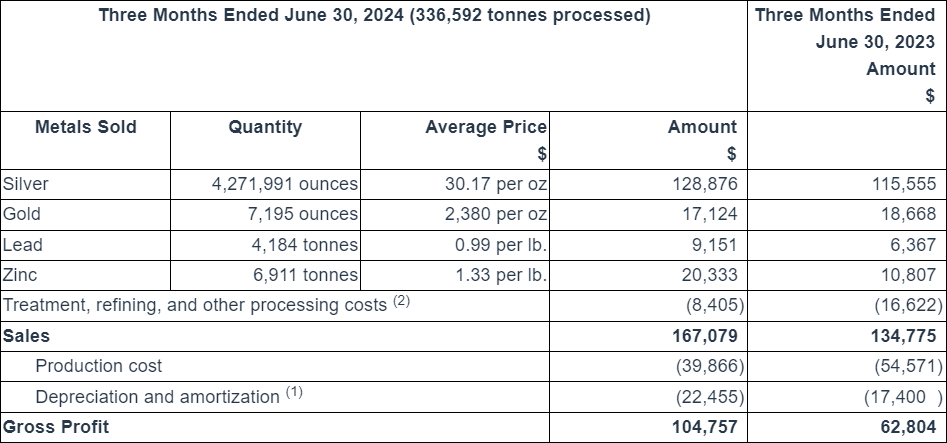 (2) Equivalent silver ounces sold have been calculated using realized prices to translate gold, lead and zinc to “equivalent” silver ounces sold (metal quantity, multiplied by metal price, divided by silver price). Three months ended June 30, 2024 realized prices: $30.17/oz silver, $2,379.85/oz gold, $0.99/lb lead and $1.33/lb zinc (three months ended June 30, 2023 realized prices: $23.69/oz silver, $1,957.47/oz gold, $0.94/lb lead and $1.07/lb zinc).