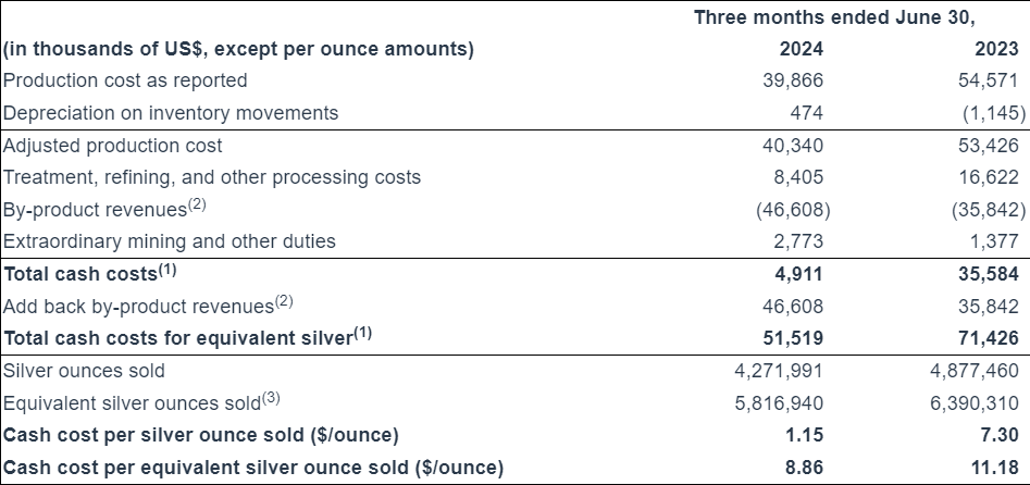 (3) Equivalent silver ounces sold have been calculated using realized prices to translate gold, lead and zinc to “equivalent” silver ounces sold (metal quantity, multiplied by metal price, divided by silver price). Three months ended June 30, 2024 realized prices: $30.17/oz silver, $2,379.85/oz gold, $0.99/lb lead and $1.33/lb zinc (three months ended June 30, 2023 realized prices: $23.69/oz silver, $1,957.47/oz gold, $0.94/lb lead and $1.07/lb).