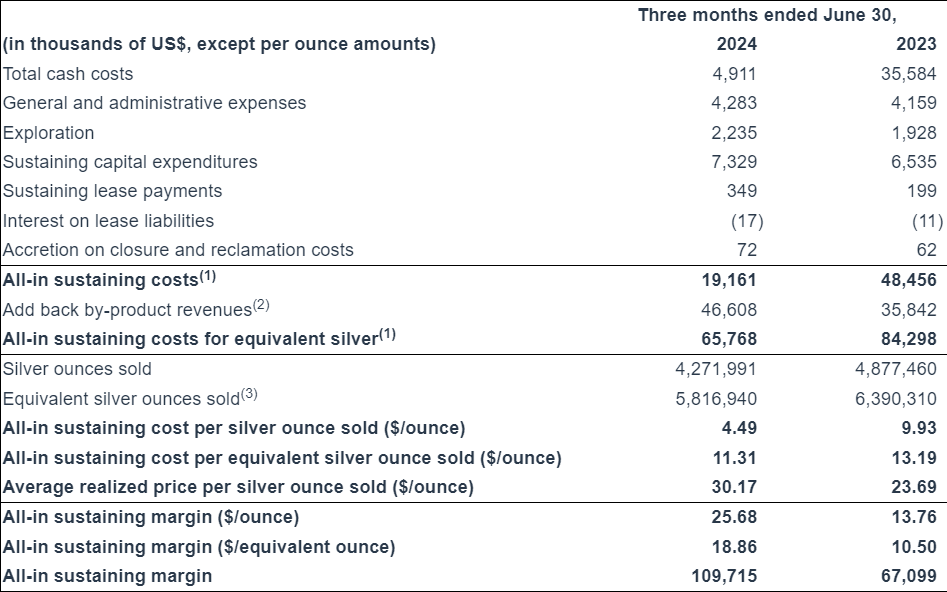 (1) Total cash costs, cash cost per ounce, cash cost per equivalent ounce, all-in sustaining costs, all-in sustaining cost per ounce, and all-in sustaining cost per equivalent ounce are non-IFRS measures, please see below “Non-IFRS Measures” section and section 12 of the Q2 2024 MD&A for a detailed reconciliation of these measures to the Q2 2024 Financial Statements. Equivalent silver ounces sold have been calculated using realized prices to translate gold, lead and zinc to “equivalent” silver ounces sold (metal quantity, multiplied by metal price, divided by silver price). Three months ended June 30, 2024 realized prices: $30.17/oz silver, $2,379.85/oz gold, $0.99/lb lead and $1.33/lb zinc (three months ended June 30, 2023 realized prices: $23.69/oz silver, $1,957.47/oz gold, $0.94/lb lead and $1.07/lb zinc).