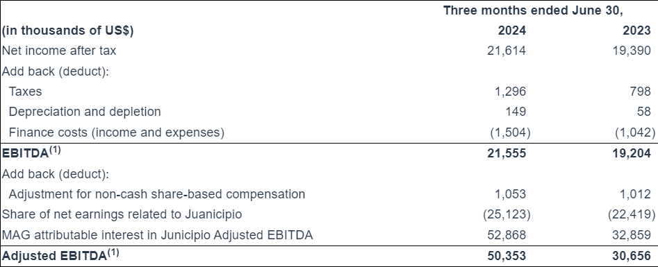 The following table provides a reconciliation of EBITDA and Adjusted EBITDA attributable to the Company based on its economic interest in Juanicipio to net income (the nearest IFRS measure) of the Company per the Q2 2024 Financial Statements. All adjustments are shown net of estimated income tax.