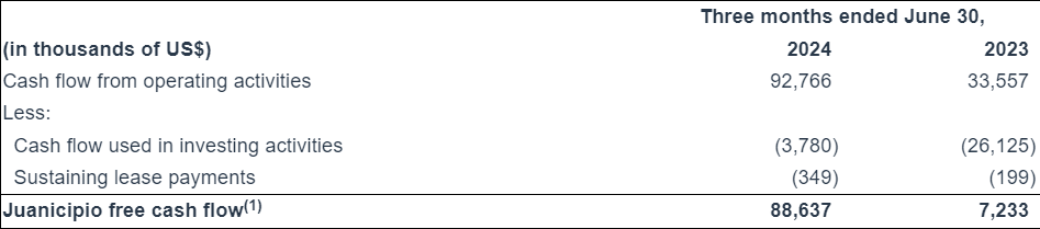 The following table provides a reconciliation of free cash flow of Juanicipio to its cash flow from operating activities on a 100% basis (the nearest IFRS measure), as presented in the notes to the Q2 2024 Financial Statements.