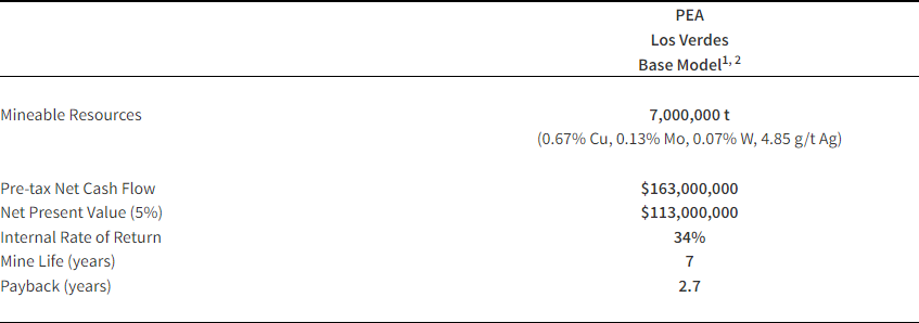 The Los Verdes deposit PEA is based on a resource estimate completed by Golder Associates which contains a total resource (measured + indicated) of 7.7MM tonnes – 0.64% copper, 0.12% molybdenum, 0.07% tungsten, 4.75 g/t silver (see Los Verdes Resource Estimate section for details). The study envisions the construction of a new mine and processing facility with an average annual production rate of approximately 1 MM tonnes over a 7-year mine life. Highlights from the study are as follows:
