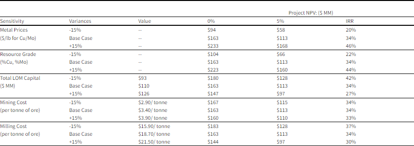 The results of a sensitivity analysis performed on the Lose Verdes deposit PEA base case economic model are shown in the table below. The sensitivity modeling demonstrates that the project economics are most impacted by variations in metal prices and mined grades and least impacted by capital requirements and operating costs.