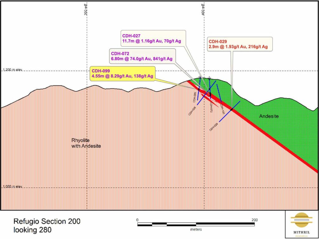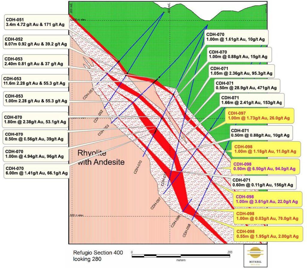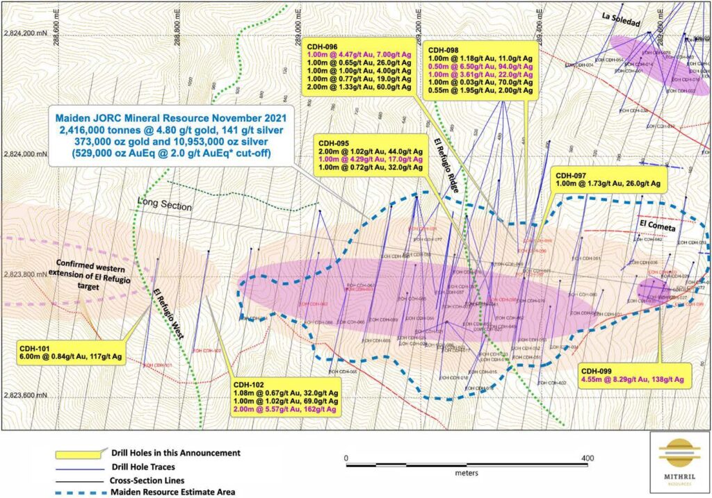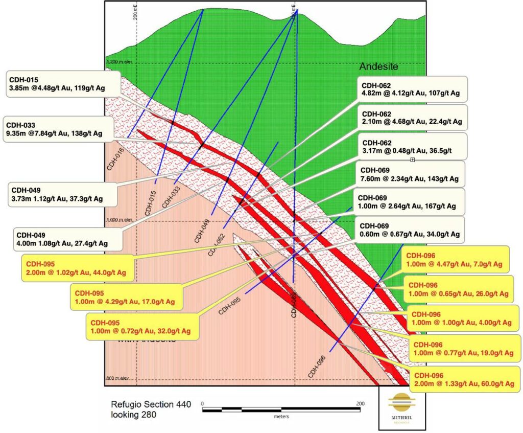 The intercepts from the recent deeper drilling on the eastern side of El Refugio show that the vein system is more extensive below the Cometa high-grade area and additional step-out drilling from sections 400 east to section 40 is warranted.
