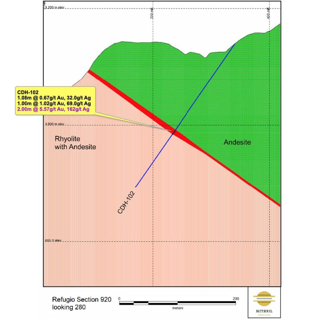 - 1.00m @ 1.02 g/t gold, 69.0 g/t silver from 183m (CDH-102)
