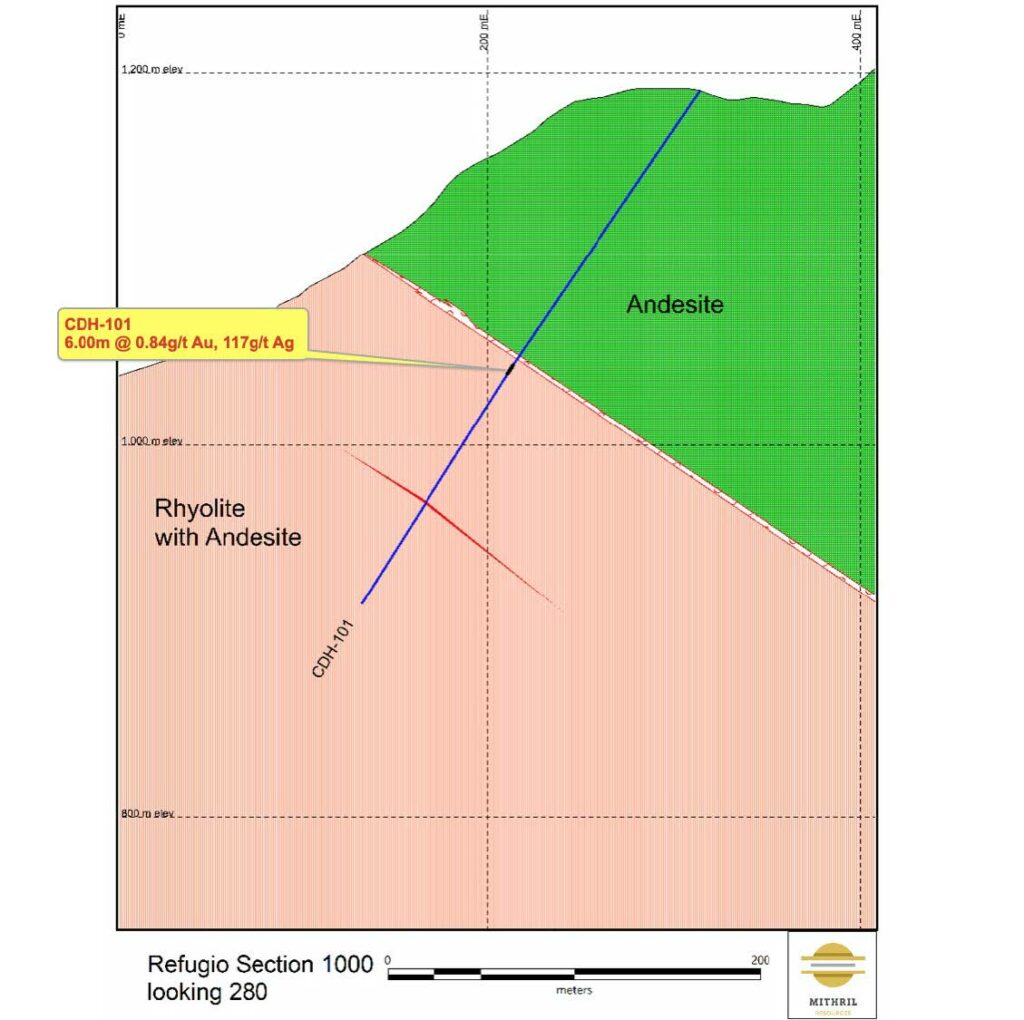 - 6.00m @ 0.84 g/t gold, 117 g/t silver from 177.2m (CDH-101, 160m west)