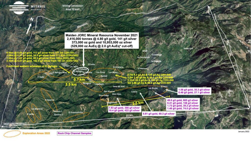 Excellent district mapping and sampling results allow other known targets areas to be assessed and prioritised for drilling in 2022. Our current funded program of up to 3,500m will further drill test La Soledad, the strong gold in soil anomaly at Los Pinos and additional exploration drill holes up to 900m west of the El Refugio resource.”