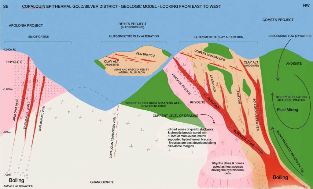 Multiple mineralisation events, young intrusives thought to be system-driving heat sources, widespread alteration together with extensive surface vein exposures and dozens of historic mine workings, identify the Copalquin mining district as a major epithermal centre for Gold and Silver.