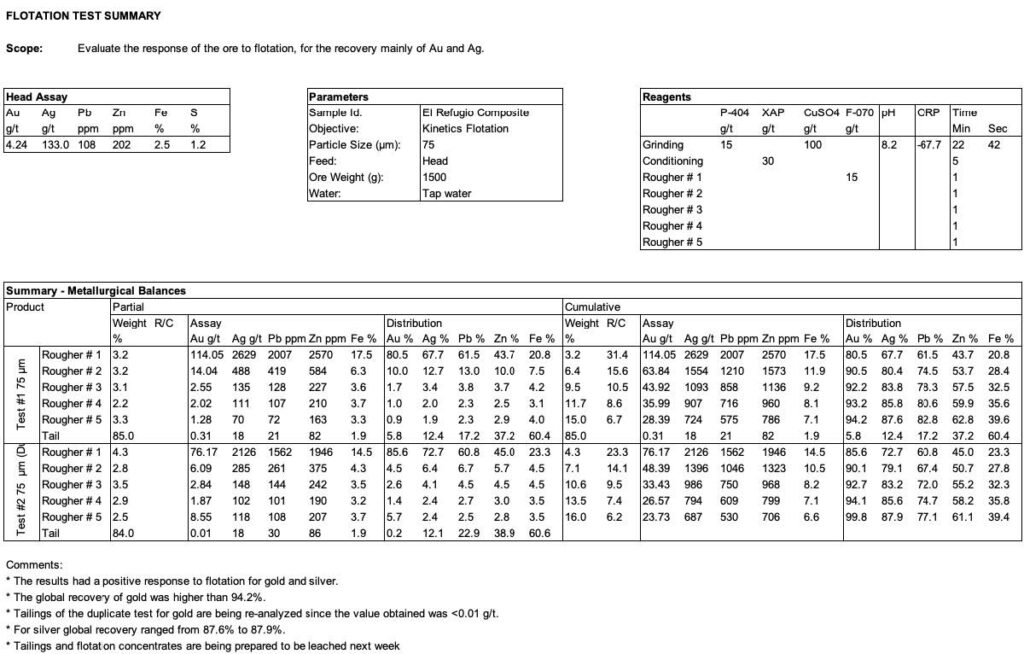 Flotation test work has been completed using the same reagent scheme determined from the Palmarejo deposit (located in the Sierra Madre Trend and north of the Copalquin District) test work, due to the similarities in geology and mineralogy between Palmarejo and El Refugio at Copalquin.