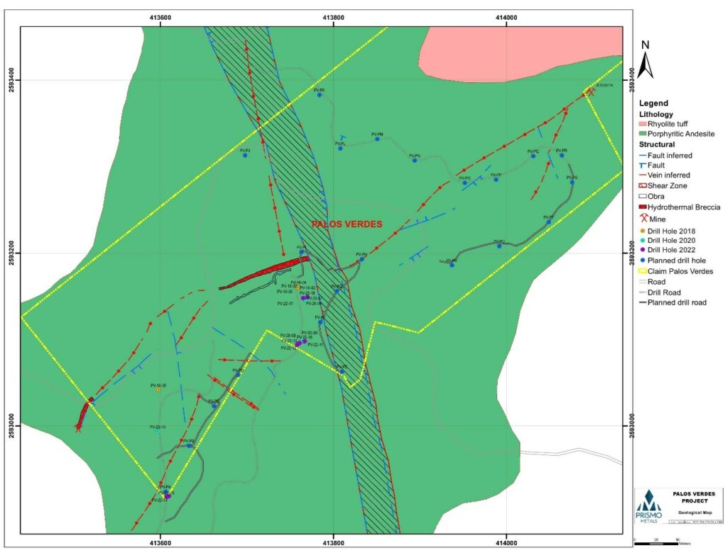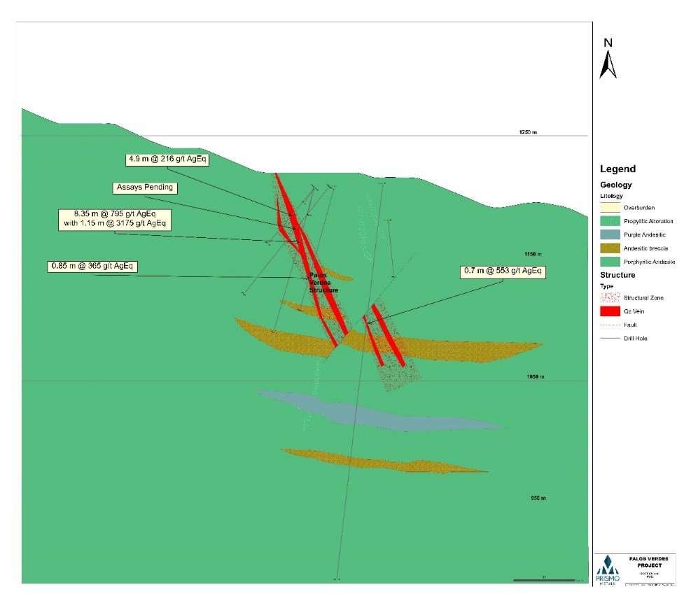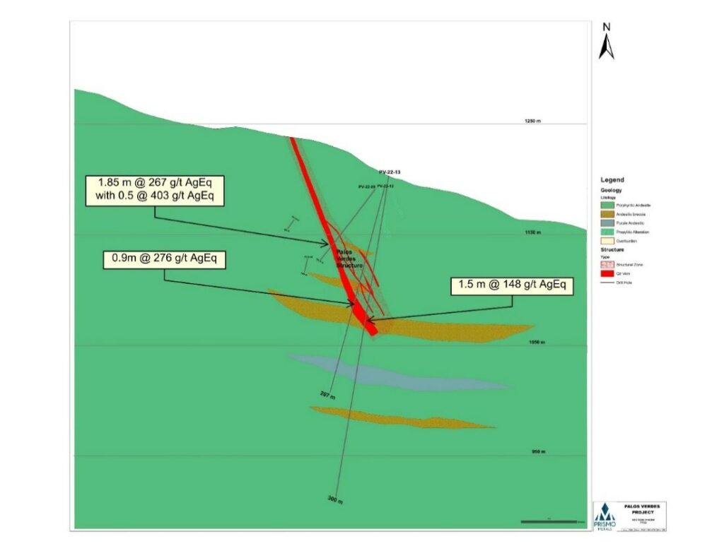 Several holes cut wide zones of mineralization, including nine meters downhole in hole PV-22-15 that averaged 187 g/t AgEq or 1.02 g/t Au with 1.1 % Pb and 1.4 % Zn. These intercepts shown in table 3 range from 50 to 150 meters below previous shallow drilling that had several high-grade intercepts. Table 3 shows the intercepts from the historic drilling with silver equivalent values shown for comparison purposes, with the best being 3,175 g/t AgEq over a true width estimated at 0.8 meters within a larger mineralized interval with 795 g/t AgEq over a true width of 5.5 meters (see Prismo’s news releases dated September 30 and December 20, 2020).