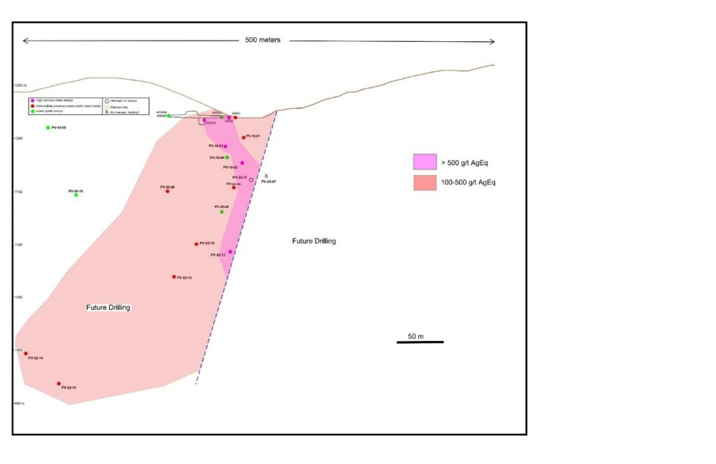 The first drill hole of the season, PV-22-11, cut 0.7 meters downhole length with 553g/t AgEq or 4.18 g/t gold and 207 g/t silver. All five holes reported here cut significant mineralization, and in general intercepts were relatively gold and base-metal rich (Table 1). The Company has completed the current drill program with almost 2,100 meters drilled in eight holes as shown in Table 2.
