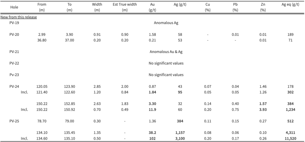 Dr. Gibson added: “Holes 24 and 25 were drilled underneath the body of mineralized vein defined by our previous drill campaigns and have further extended the zone of high-grade mineralization. Holes drilled near the northeastern limit of the concession and vein outcrop seem to confirm the interpretation that this area has been down-dropped along the northwesterly striking fault zone that crosses the center of the Palos Verdes concession, and provides information that will allow targeting by deeper drilling.”