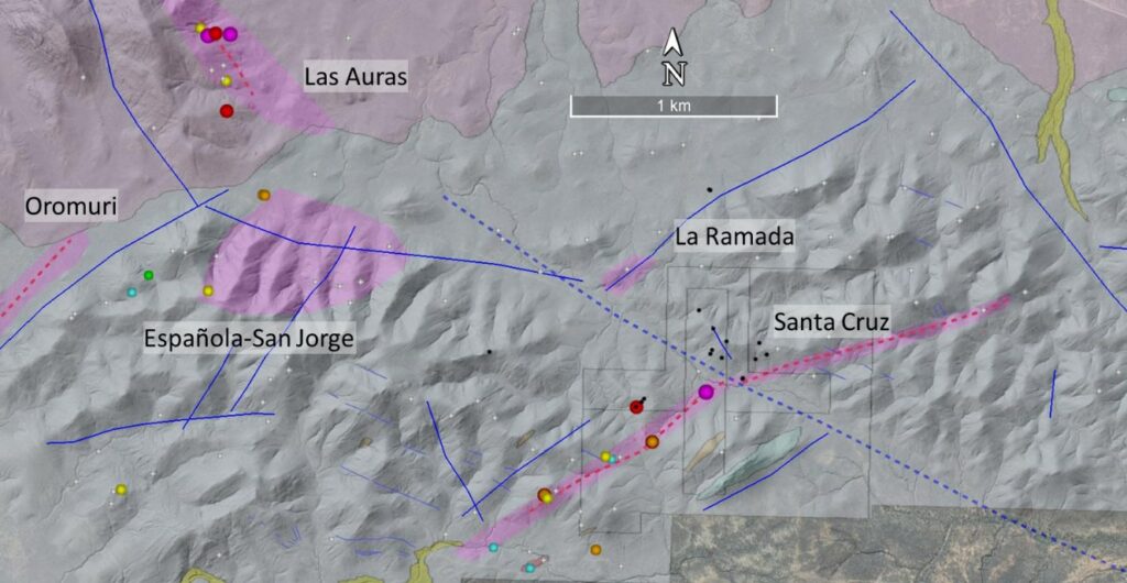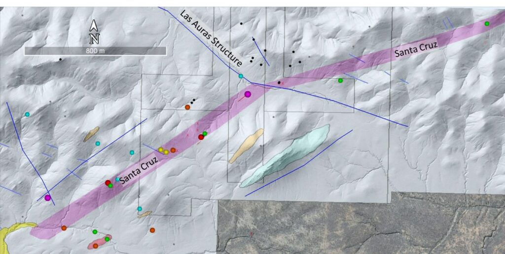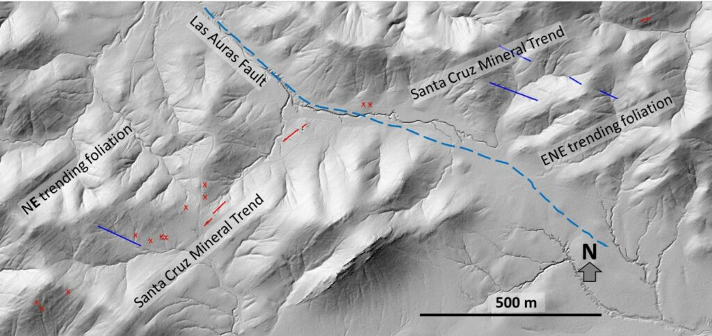 Mineralization at Los Pavitos consists of quartz veins and stockworks hosted in metasediments, in shear zones and parallel to foliation and crossing foliation. Three mineralized trends have been recognized through limited exploration that has been carried out. Two trends, the NE Santa Cruz trend and the NW Las Auras trend intersect in an area of small mines and prospects on the internal concessions mentioned previously and extend onto the Los Pavitos concession. The NE Omuri trend is parallel to the Santa Cruz trend about two kilometers to the northwest of the intersection of the other trends, and also intersect the La Auras trend.