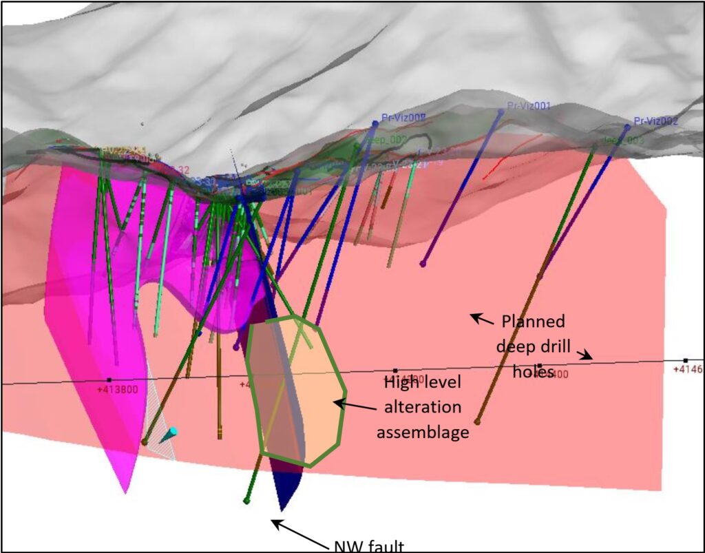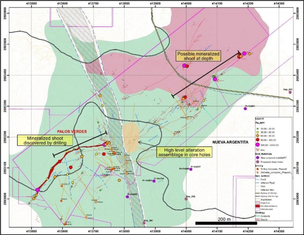 Holes PV-23-26 and PV-23-28 explored to the east of the NW fault and did not cut significant mineralization but provided valuable information for the next holes that need to be drilled deeper from the adjoining Vizsla Silver ground.
