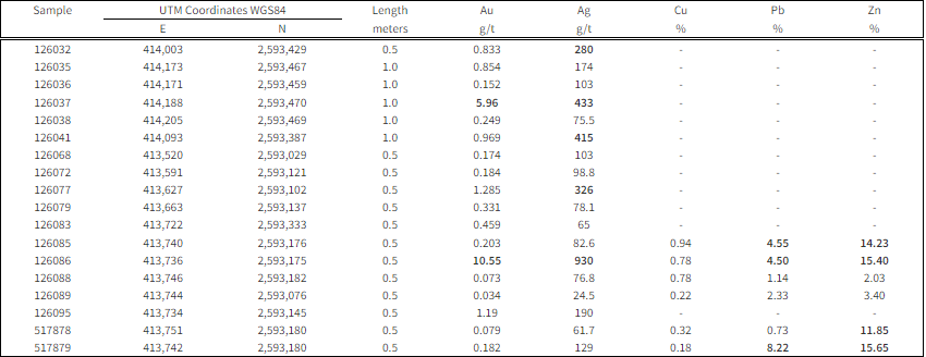 - This interval is within a wider 2.6-meter interval with 384 g/t Ag equivalent (32 g/t Ag, 3.3 g/t Au and 1.57% Zn)