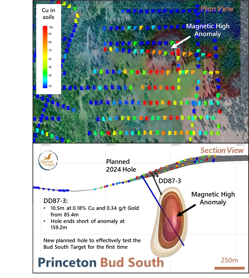 The drill program will follow up on historic drilling at Bud South. The target has a significant copper in soils footprint over a strong magnetic high, with surface trenches exposing porphyry intrusions and alteration. In 1987 the target was drilled with three holes. The first and second holes were abandoned at shallow depths due to bad ground. The third, DD87-3 on the edge of the magnetic high, returned 10.5 metres of 0.18% copper and 0.34 g/t gold.
