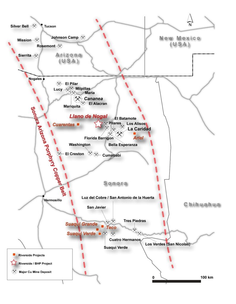Riverside’s Llano del Nogal Project tenure is a land package fully owned by Riverside with indications for porphyry Cu and post-mineral Baucarit middle and late Tertiary gravel cover. Riverside’s tenure is located within the prolific Cananea-La Caridad porphyry copper trend. The Project is located 35 km northwest of the La Caridad mine that after 35 years of historic mining, has a measured and indicated mineral resource of over 6.4 Bt at 0.17% copper[1]. The Project is also located 60 km southeast of the Cananea (Buenavista Mine), one of the world’s largest porphyry copper deposits with a total global resource of over 15Bt at 0.22% copper1 remaining after more than 120 years of continuous mining.