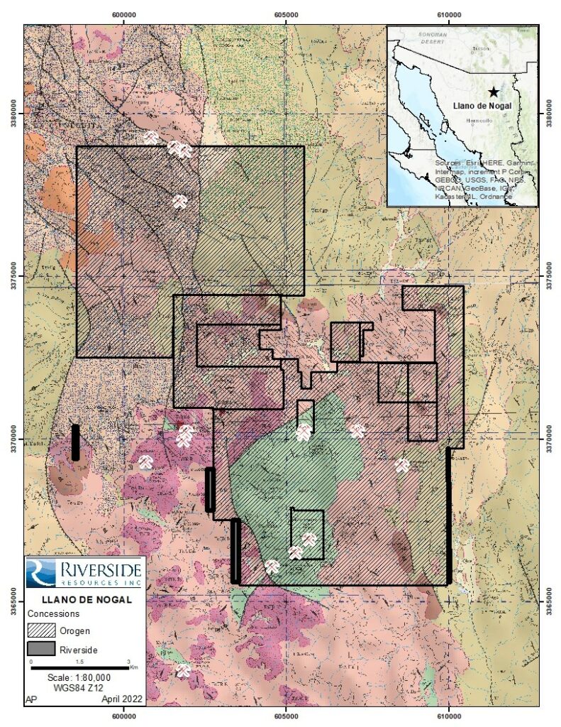Vancouver, British Columbia–(Newsfile Corp. – May 5, 2022) – Riverside Resources Inc. (TSXV: RRI) (OTCQB: RVSDF) (FSE: 5YY) (“Riverside” or the “Company”),working with funding partner BHP,is pleased to report that it has signed an option agreement with Orogen Royalties Inc. (TSXV: OGN) (“Orogen”) to acquire 100% interest in the Llano de Nogal copper project (the “Project”) in Sonora, Mexico as a new property acquisition within the BHP – Riverside Sonora Mexico Exploration Financing Agreement (“EFA”). The Llano de Nogal Project will become the fifth active Work Project within the EFA. The new project will have an exploration budget of USD $1,000,000 for the initial work phase of geology, geophysics and geochemistry. Riverside previously acquired minor tenure of the Llano de Nogal district from Millrock Resources in 2019 and has subsequently worked with BHP on the Project through the EFA to consolidate a larger portion.