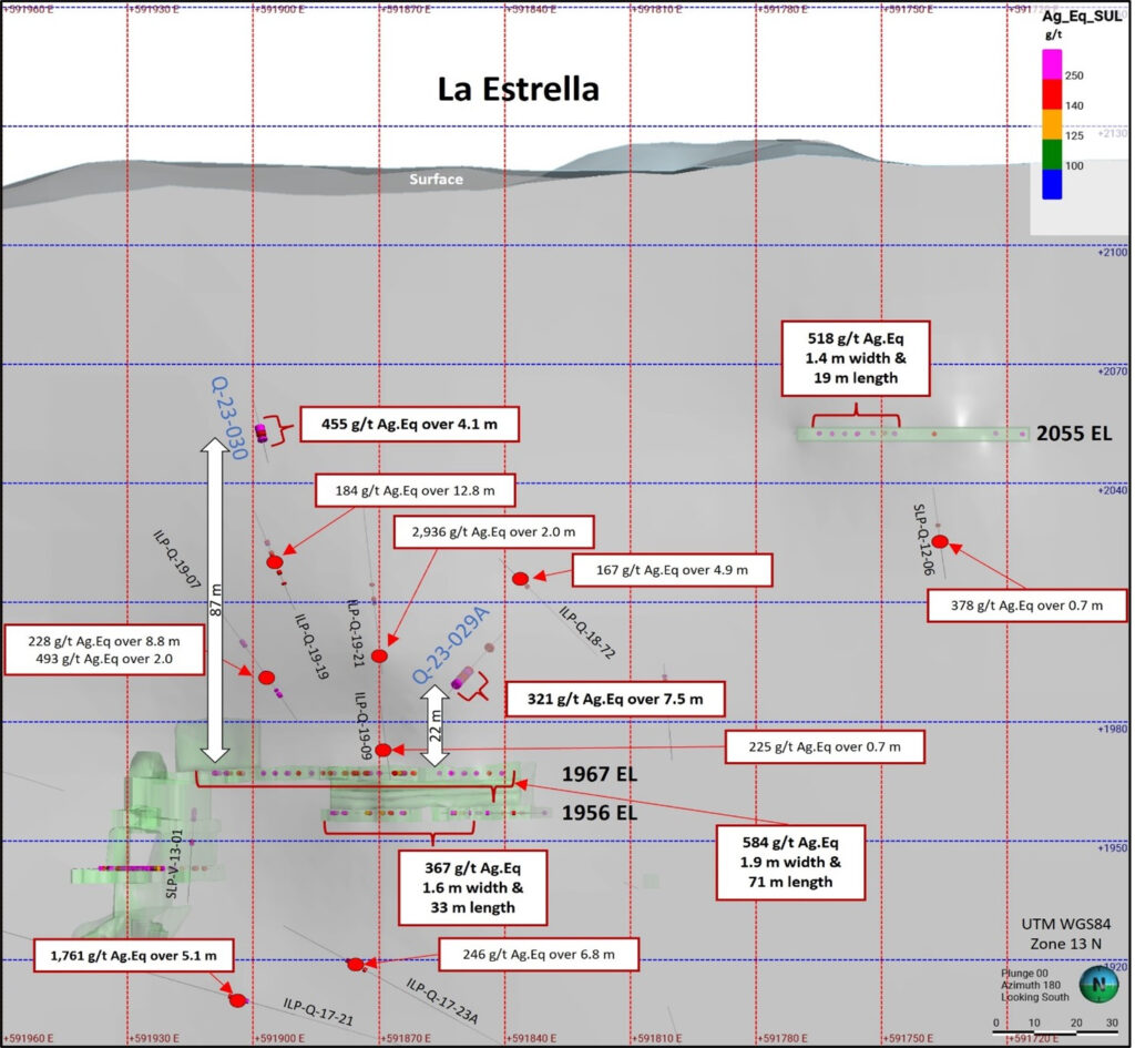 - Hole Q-23-030 intersected the La Estrella Zone returning 455 g/t Ag.Eq1 over 4.13 metres (“m”) including 1,617 g/t Ag.Eq over 0.60 m