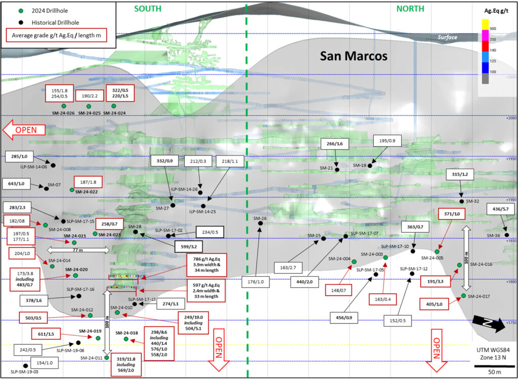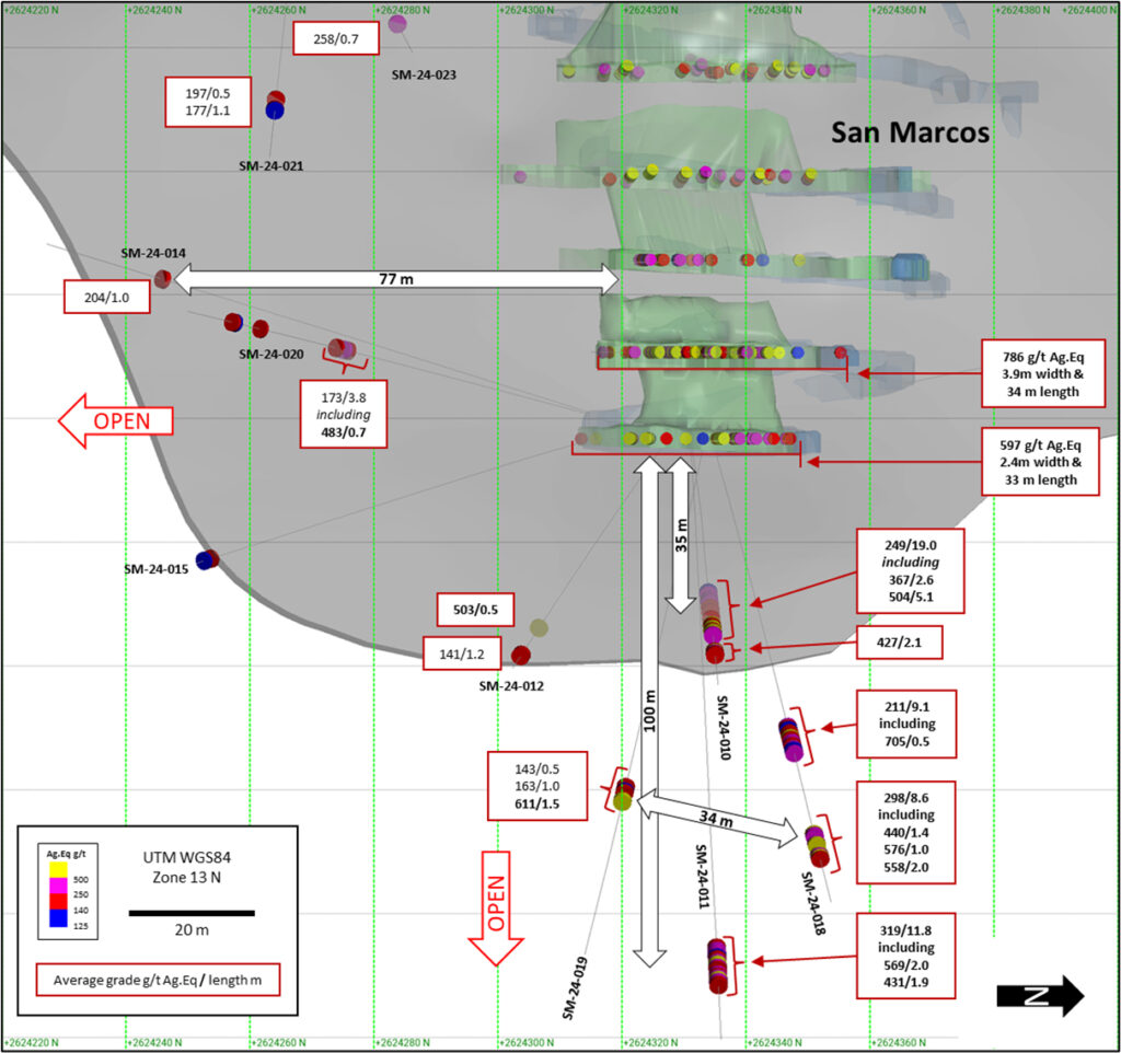 Holes SM-24-024 to 026 were drilled to test oxide mineralization in the upper undeveloped levels of the San Marcos Zone and are approximately 40 m above the last development in this area and 95 m below surface. Hole SM-24-024 returned 322 g/t Ag.Eq over 0.50 m (45.55 to 46.05 m), 220 g/t Ag.Eq over 1.45 m (49.45 to 50.90 m), and 211 g/t Ag.Eq over 1.60 m (58.56 to 60.16 m). Hole SM-24-025 returned 190 g/t Ag.Eq over 2.20 m (45.00 to 47.20 m). Hole SM-24-026 returned 155 g/t Ag.Eq over 1.76 m (59.74 to 61.50 m), 254 g/t Ag.Eq over 0.54 m (63.29 to 63.83 m), and 396 g/t Ag.Eq over 0.50 m (74.15 to 74.65 m). These results confirm the potential of the upper near surface levels of the mine at the southern limit of development where the San Marcos Zone remains open to the south. Further drilling is planned in this area.