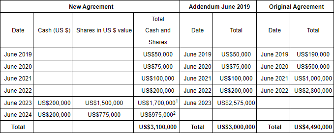 - The 2024 payment will comprise US$200,000 in cash and US$775,000 in shares. Regarding the shares, there will be a hold period of 4 months post issuance. One year after the hold period expires, only 2 weeks’ notice is required to announce the intention to sell the shares.