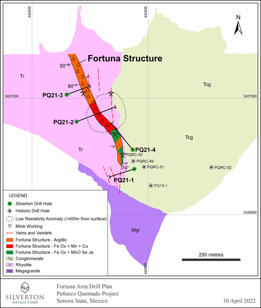 John Theobald President and CEO commented “The drill holes completed demonstrate that the mineralized system at the Peñasco Pit target continues beyond the historic resource limits. The continuation of the mineralization offers potential to expand the historic resource. I am also encouraged by the intersections of silver and copper mineralization on the Fortuna target which is one of several geophysical anomalies identified across the property. Silverton will continue to explore the property to identify additional drilling targets. Silverton geologists are also evaluating the potential for updating the historic 9.6 million Oz Ag resource1 with the view to commissioning a current resource estimate.